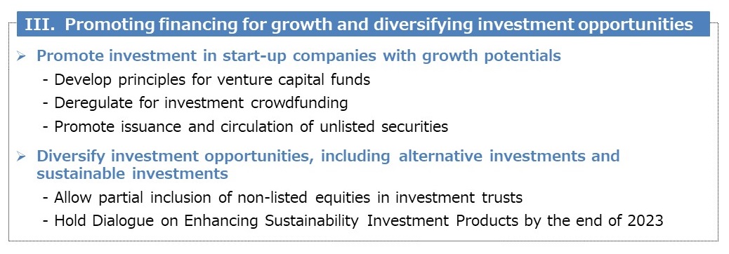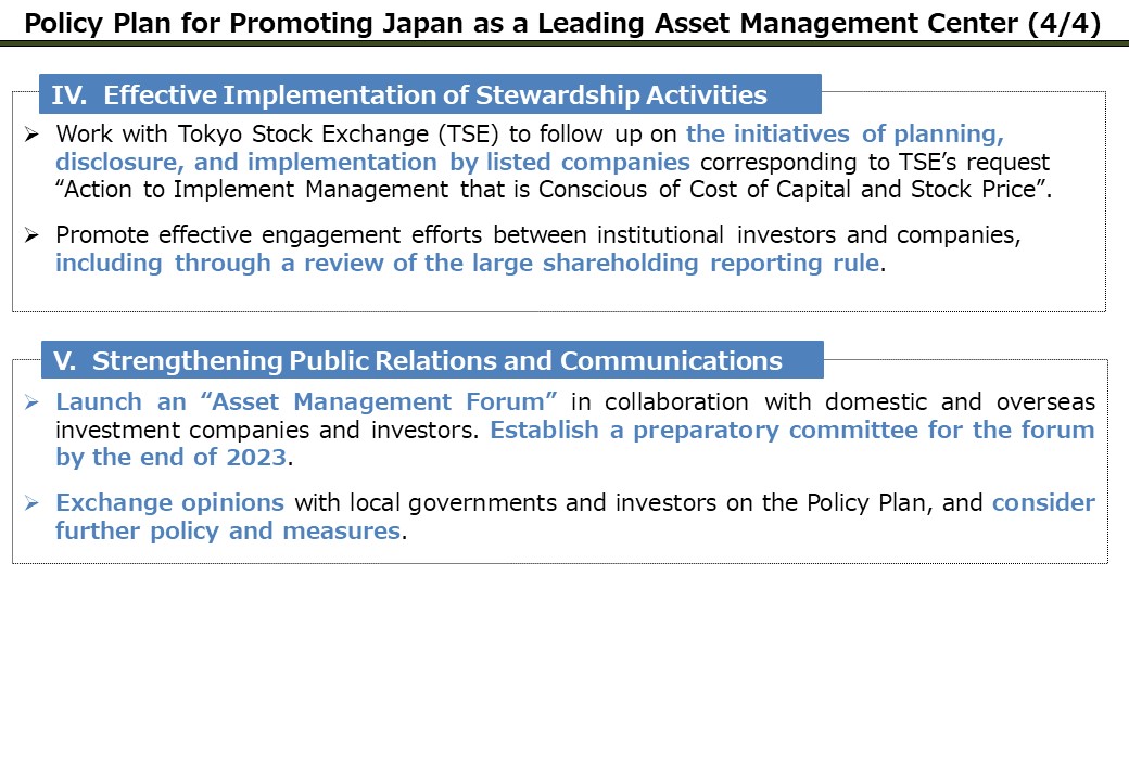 "Policy Plan for Promoting Japan as a Leading Asset Management Center" is the remaining piece for the growth of Japan’s economy and Japanese people’s asset income. The Plan centers on: (i) reforming Japan’s asset management sector; (ii) reforming asset ownership in Japan; (iii) promoting financing for growth and diversifying investment opportunities; (iv) effective implementation of stewardship activities; and (v) strengthening public relations and communications.