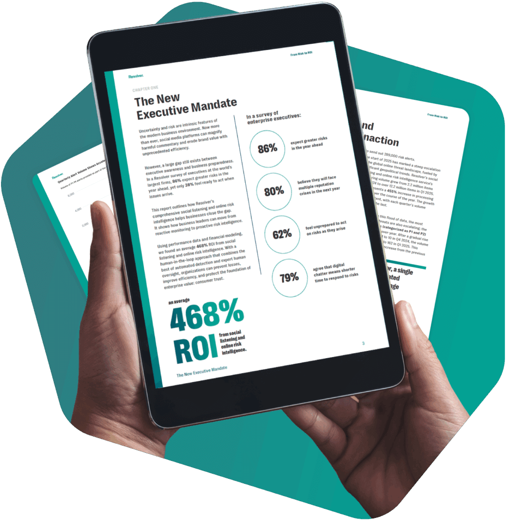 Uncertainty and risk have become constant. This report shows how leading organizations are turning online risk into ROI. Using Resolver’s social listening and online risk intelligence service, businesses are achieving an average 468% ROI by preventing crises, protecting revenue, and safeguarding consumer trust.