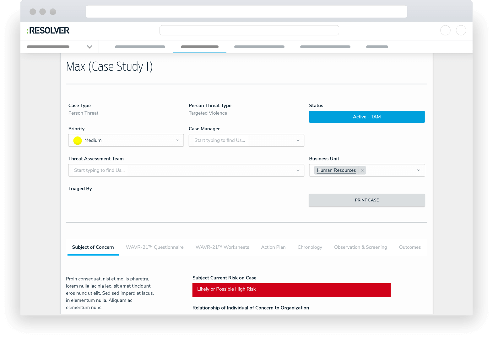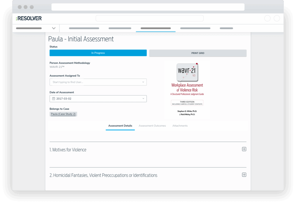 The ‘WAVR’ is quickly emerging as the most widely used threat assessment instrument within workplace and campus contexts. Adapting the solid foundation of the WAVR-21™ V3 content to Resolver’s modern cloud technology, the WAVR-21™ Violence Threat Assessment app delivers a significantly improved violence risk assessment and team collaboration experience. The full WAVR-21™ V3 content is contained within the app– including the revised Intake and Documentation Questionnaire, the updated assessment Worksheet and Grid, the comprehensive manual, and an eUser’s Guide.