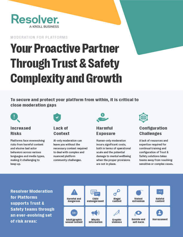 Platforms need to swiftly and effectively eliminate problematic content and bad actors in order to maintain a safe, vibrant community and remain compliant. With Resolver’s Moderation for Platforms solution, Trust & Safety teams can secure and protect their platform from within by taking action against harmful content and bad actors, while keeping pace with emerging risks.