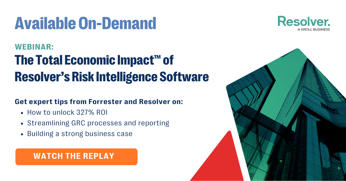 In partnership with Forrester, you can now review the slide deck, download the full TEI report, and watch the video replay on “The Total Economic Impact™ (TEI) of Resolver’s Risk Intelligence Software.“ Take a closer look at the content from Forrester’s Principal Consultant, Julia Fadzeyeva, Resolver’s Product Director, Ryan Napoleone, and Product Marketing Manager, Pooja Azhalavan, to gain key insights from the TEI study and learn how to make an integrated GRC business case. Also, examine the potential ROI enterprises may realize by deploying Resolver’s software.