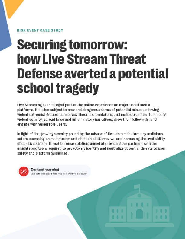 The security and reputational threats arising from the misuse of ‘livestreaming’ features are growing in scope and severity. A recent incident that saw a partner platform employ our Livestream Threat Defense solution to take a swift and proactive response to foil a school shooting in the US highlights the efficacy of our bespoke solution.