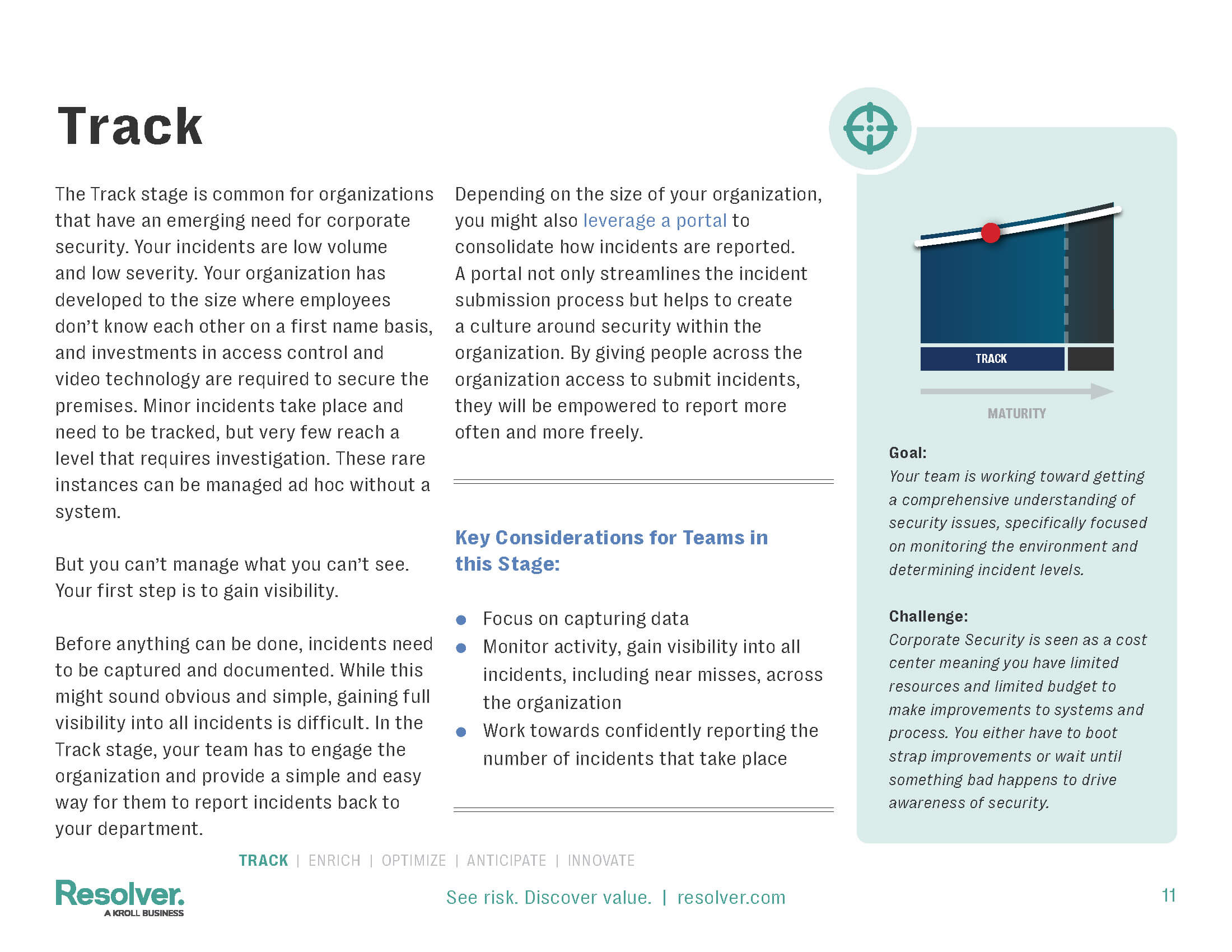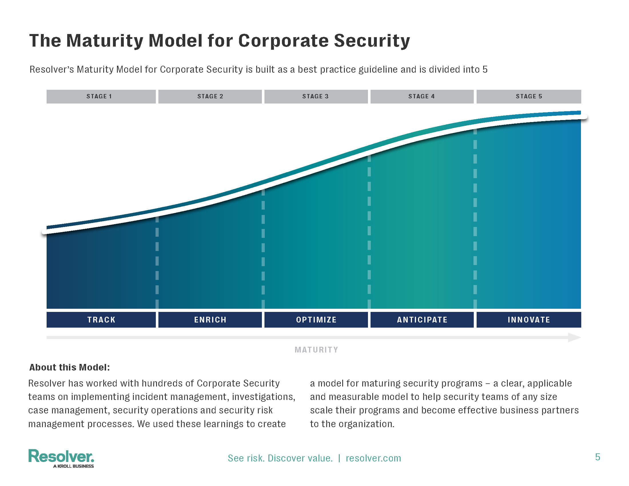 Corporate security teams often hit a plateau, managing daily tasks reactively without a clear path to elevate their security strategy. Resolver's Maturity Model for Corporate Security is designed to address this challenge, offering a systematic approach to assess, benchmark, and improve security practices against industry standards. Resolver has worked with hundreds of Corporate Security teams on implementing incident management, investigations, case management, security operations and security risk management processes.We used these learnings to create a model for maturing security programs — a clear, applicable and measurable model to help security teams of any size scale their programs.By leveraging the Maturity Model, teams will have a clear path to optimize operations — transforming the role of the security team and paving the way for them to become effective business partners across the organization. The outcome is a well-oiled security function that is integral to business strategy, with clear operational benefits, risk mitigation, and demonstrable value to the organization.