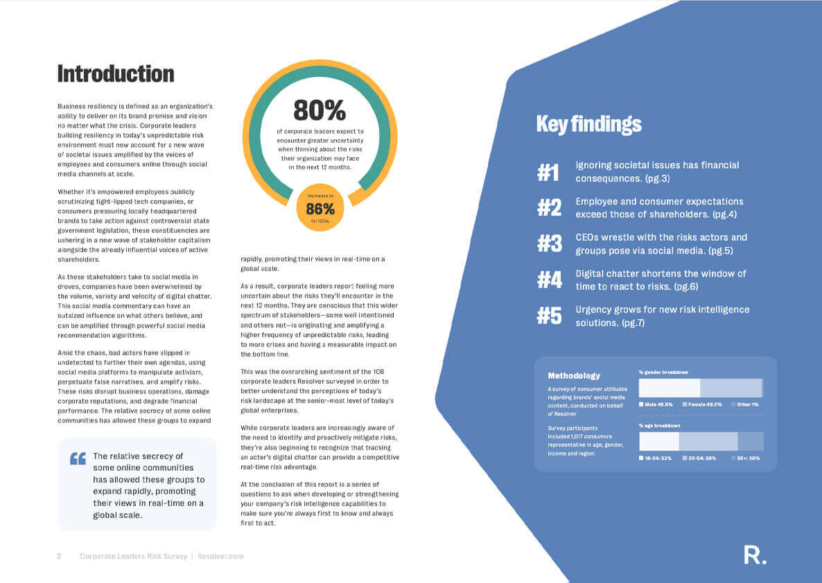 Resolver is the most trusted provider of Corporate Risk Intelligence for the C-suite. Our AI technology, coupled with our expert human intelligence teams, has been trained since 2005 to discover and track the risk signals embedded within digital chatter before they become a crisis. A Forrester Consulting study revealed that our customers reduced the impact of a crisis by 40 percent, prevented one-in-three crises per year entirely and achieved a 572% ROI. Today we defend over $6.5 trillion in combined market capitalization for over 1,000 brands. We can protect yours too.