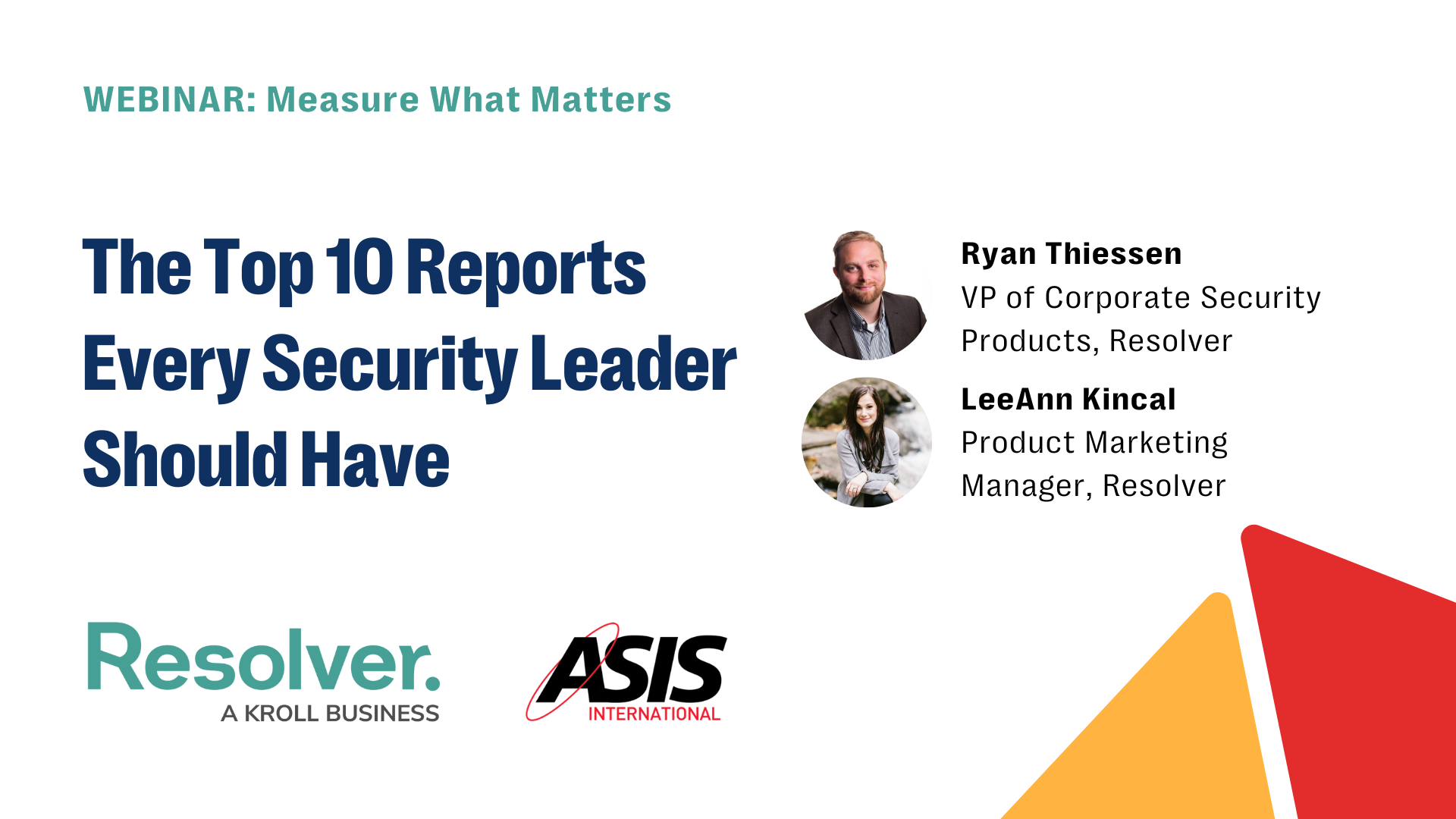 And thank you again for joining today’s webinar, “Measure What Matters: The Top 10 Reports Every Security Leader Should Have,” sponsored by Resolver. I’d now like to introduce and welcome today’s speakers, Ryan Thiessen, VP of Corporate Security Products, and LeeAnn Kincal, Product Marketing Manager, both of Resolver. Hello and welcome to you both. And with that, I will hand things over to you all.